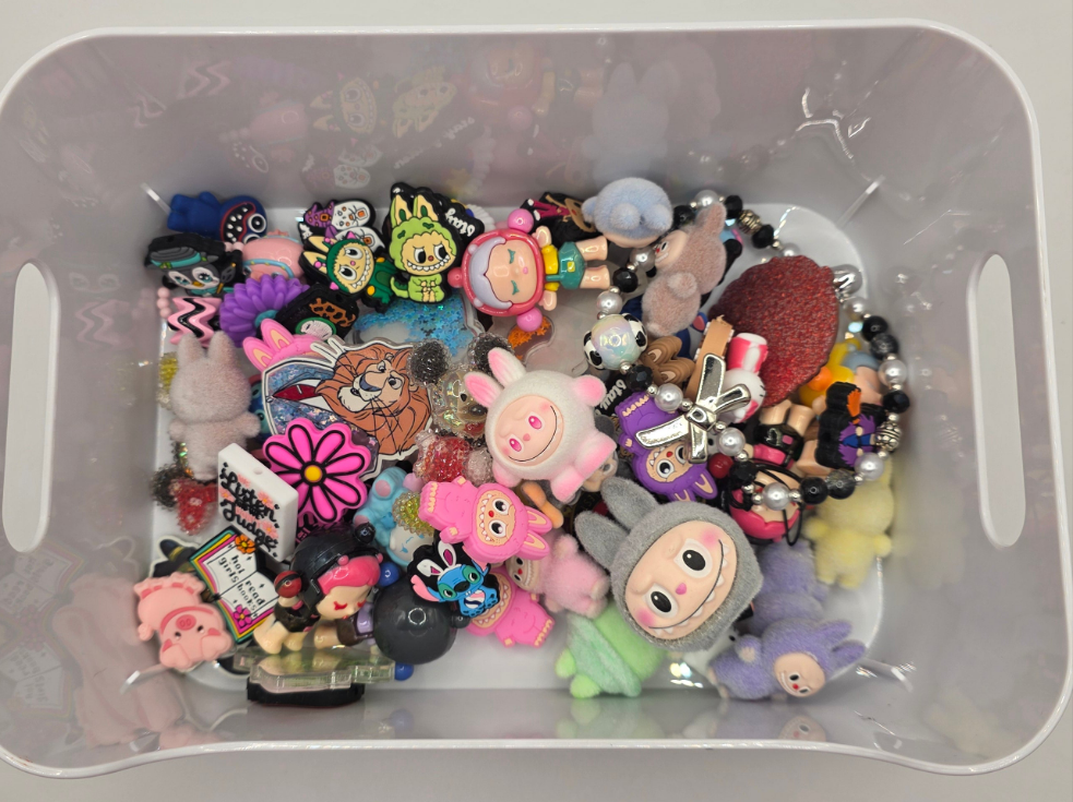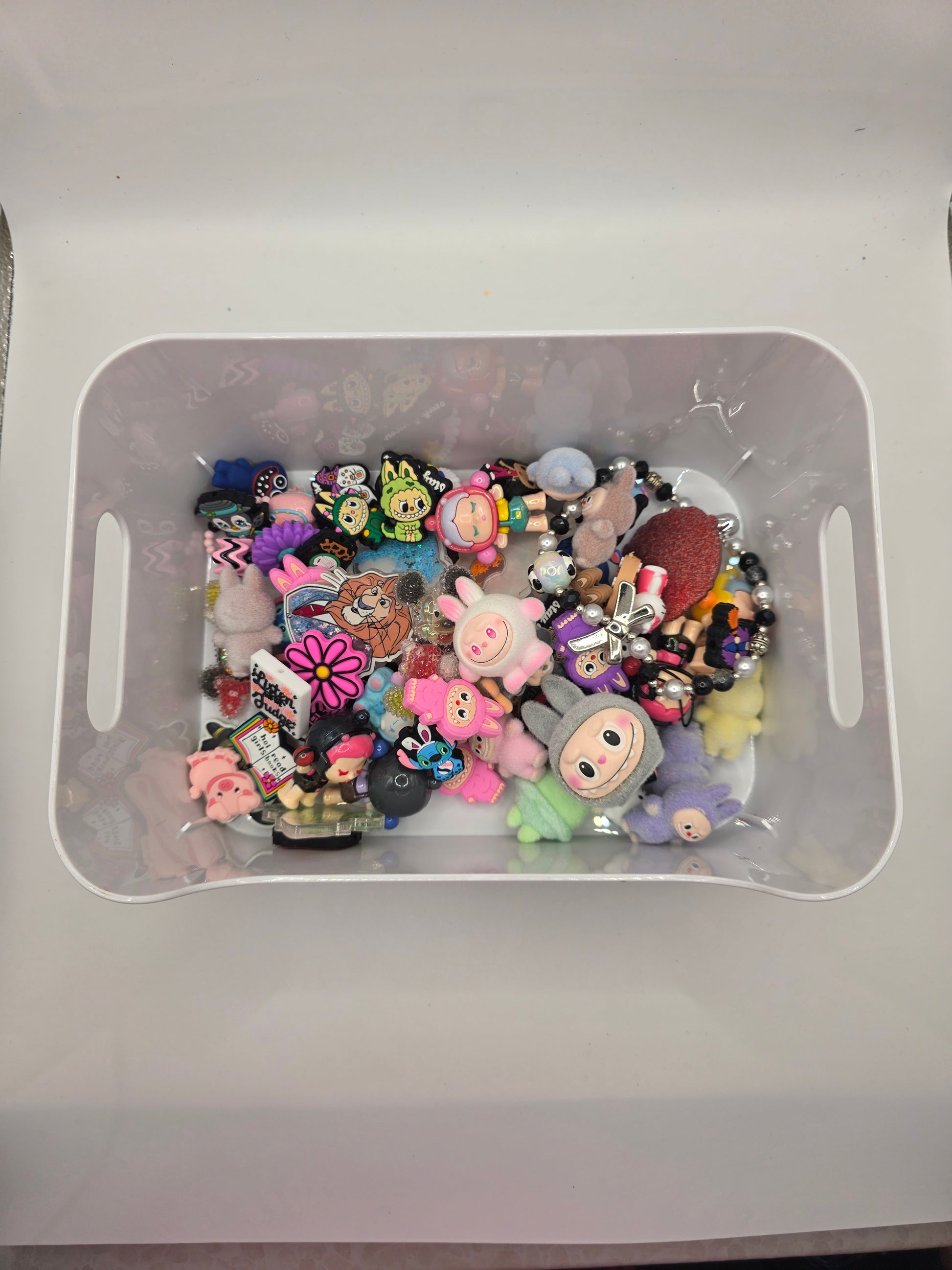 scoops include a mix of focals, beads, labubus beads, skull pandas, hks, acrylics, shakers, phone charms, beaded bracelets